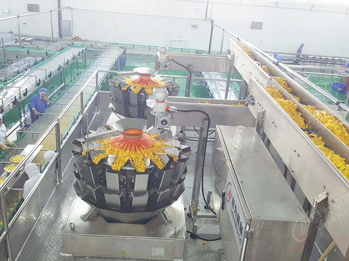(2)按主機能力配置不同規模的連續化生產線。故蘿生產線視四道機(去皮、切端、通芯、括肉)的能力80個/min機分級規格進行配置。桃子生產線視桃瓣挖核機的能力70~80個/min及分級規格進行配置。火腿生產線能力750kg、1000kg、1500kg、2000kg進行配置。