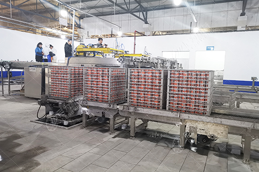 卸籠系統是將殺菌完成后的實罐整體、逐層、平穩地推至卸籠網帶線上,再借由輸送線傳至噴洗、吹干、噴碼、包裝等下道工序,整個卸籠過程可自動回收隔板至隔板庫,以便后續裝籠機循環使用隔板;自動卸瓶,食品筐內產品自動升降,直至卸完籠筐,空籠自動停止卸籠作業。