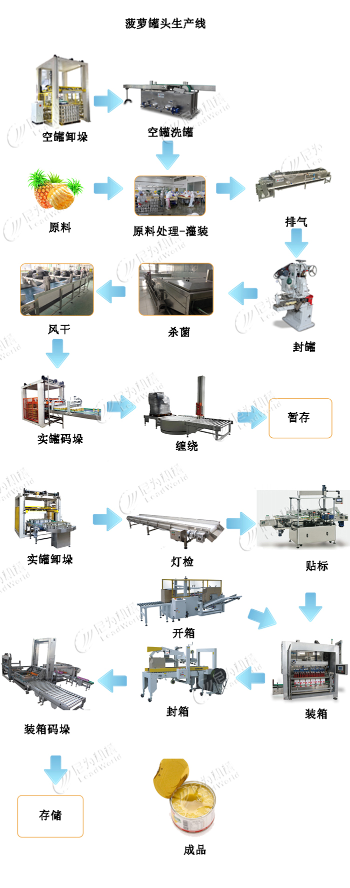 尼為為您提供全套的菠蘿罐頭生產(chǎn)線設(shè)備,菠蘿通過(guò)預(yù)處理、調(diào)味后,需要進(jìn)行裝罐、真空密封、殺菌、貼標(biāo)、裝箱、全自動(dòng)碼垛機(jī)。這樣既保持了菠蘿的口感又解決了菠蘿的儲(chǔ)存問(wèn)題。