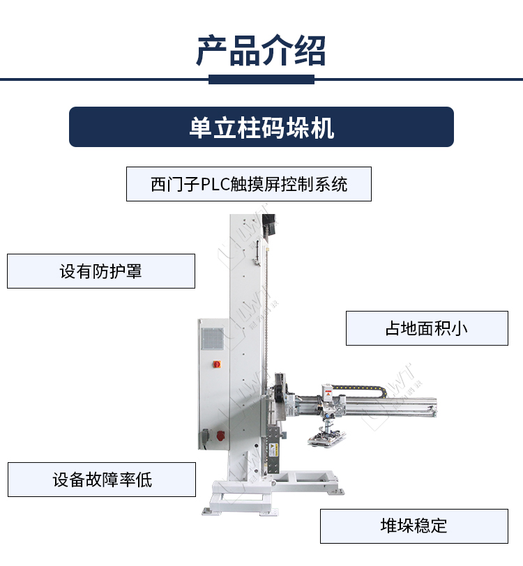 3. 單柱碼垛設計使設備占地面積小,有利于在空間有限的場所進行安裝和布局,并且方便后續的設備維護工作。